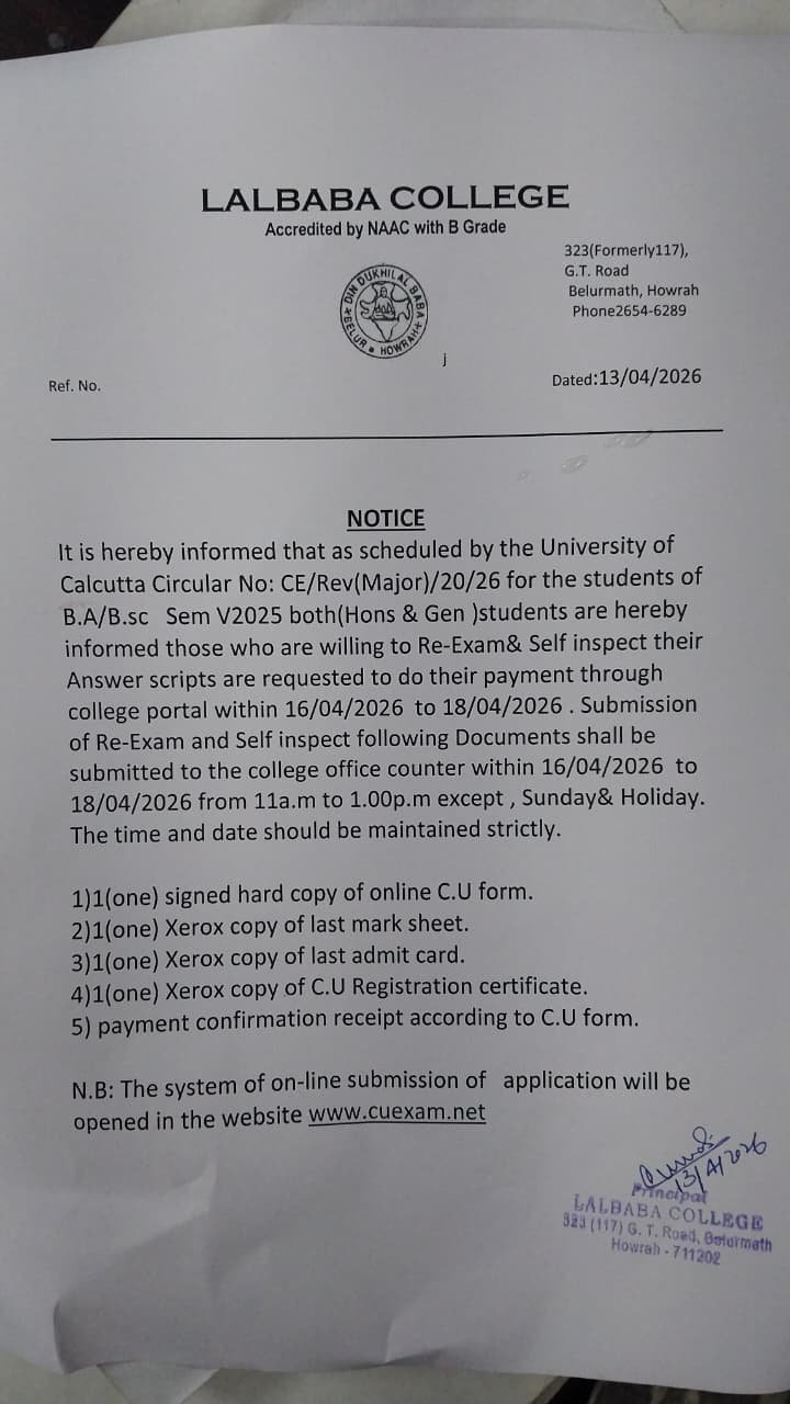 Lalbaba College is a conglomeration of approximately four thousand students, more than eighty teachers and more than twenty non-teaching staff. It has grown into a seminary of modern learning over the years. The catchment area of the college includes its adjacent agricultural and industrialized region of the district of Howrah as also neighbouring agricultural belt of the district of Hooghly. Although initially conceived merely to promote higher education among the local youth, its hinterland of student input has increased immensely during the last decade. Students today rush here to materialize their dreams with regard to choice of subjects in higher education from distant areas connected by the Barddhaman Main and Chord lines and the Tarakeswar section of Eastern Railway and the Kharagpur section of South Eastern Railway. This is because of the fact that the college is located adjacent to Kolkata. It is just on the opposite bank of the river Hooghly next to Belur Math, the world famous monastic establishment founded by Swami Vivekananda. It is easily accessible by rail, only six kilometers journey from Howrah and fifteen kilometers from Sealdah. The nearest railway stations are Belur in the Howrah - Barddhaman Section, Belurmath in Howrah - Belurmath Section and Bally Ghat in the Sealdah – Dankuni Section of Eastern Railway. As the college is situated conveniently besides Grand Trunk Road, the facility of frequent bus services can also be availed of to reach the college.