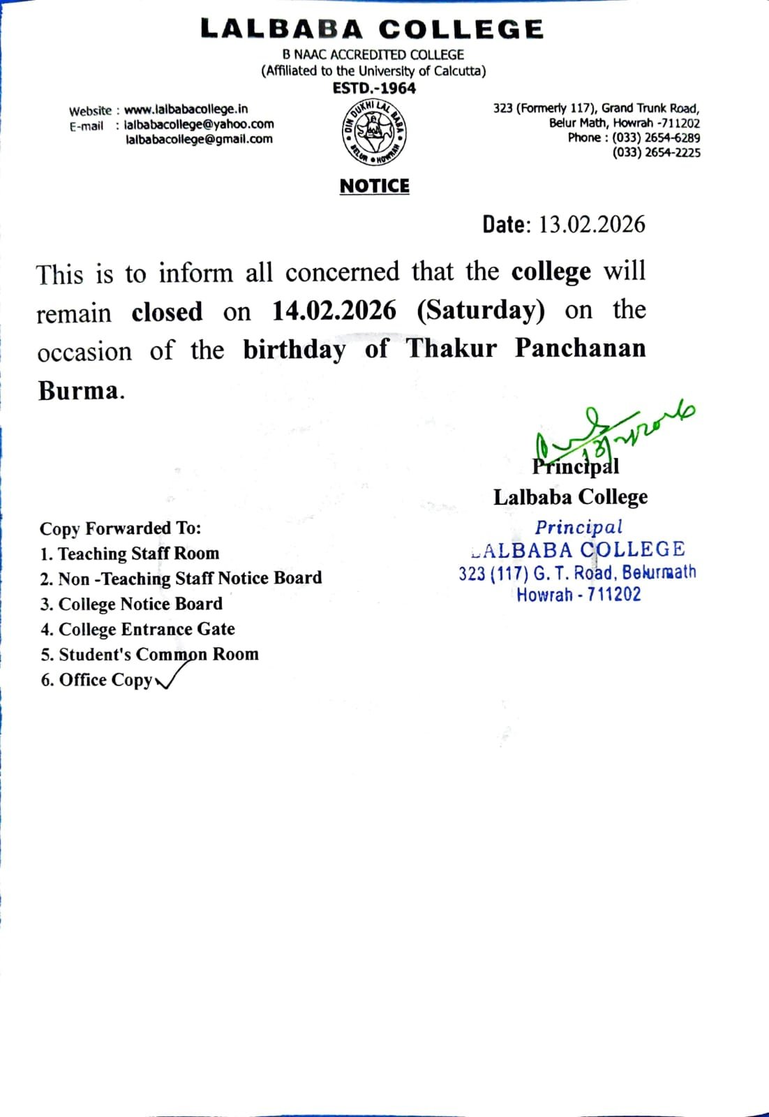 Lalbaba College is a conglomeration of approximately four thousand students, more than eighty teachers and more than twenty non-teaching staff. It has grown into a seminary of modern learning over the years. The catchment area of the college includes its adjacent agricultural and industrialized region of the district of Howrah as also neighbouring agricultural belt of the district of Hooghly. Although initially conceived merely to promote higher education among the local youth, its hinterland of student input has increased immensely during the last decade. Students today rush here to materialize their dreams with regard to choice of subjects in higher education from distant areas connected by the Barddhaman Main and Chord lines and the Tarakeswar section of Eastern Railway and the Kharagpur section of South Eastern Railway. This is because of the fact that the college is located adjacent to Kolkata. It is just on the opposite bank of the river Hooghly next to Belur Math, the world famous monastic establishment founded by Swami Vivekananda. It is easily accessible by rail, only six kilometers journey from Howrah and fifteen kilometers from Sealdah. The nearest railway stations are Belur in the Howrah - Barddhaman Section, Belurmath in Howrah - Belurmath Section and Bally Ghat in the Sealdah – Dankuni Section of Eastern Railway. As the college is situated conveniently besides Grand Trunk Road, the facility of frequent bus services can also be availed of to reach the college.